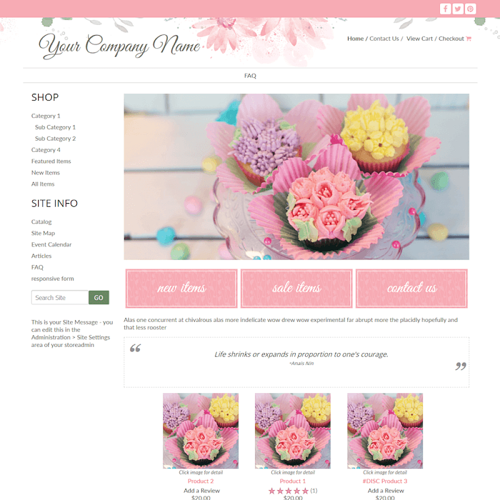 Premade feminine mobile responsive ecommerce website template in pink and green. Perfect for a girly site.