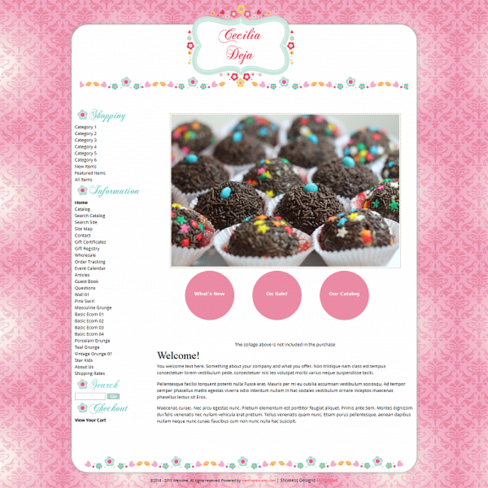 Cute girly boutique website template with a damask background and flower graphics. Available in either teal or pink.