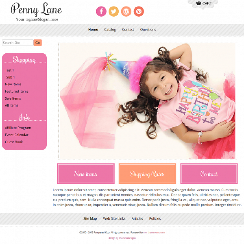 Colorful, playful boutique website template. Ideal for a children’s clothing site or girls’ boutique. Mobile Responsive