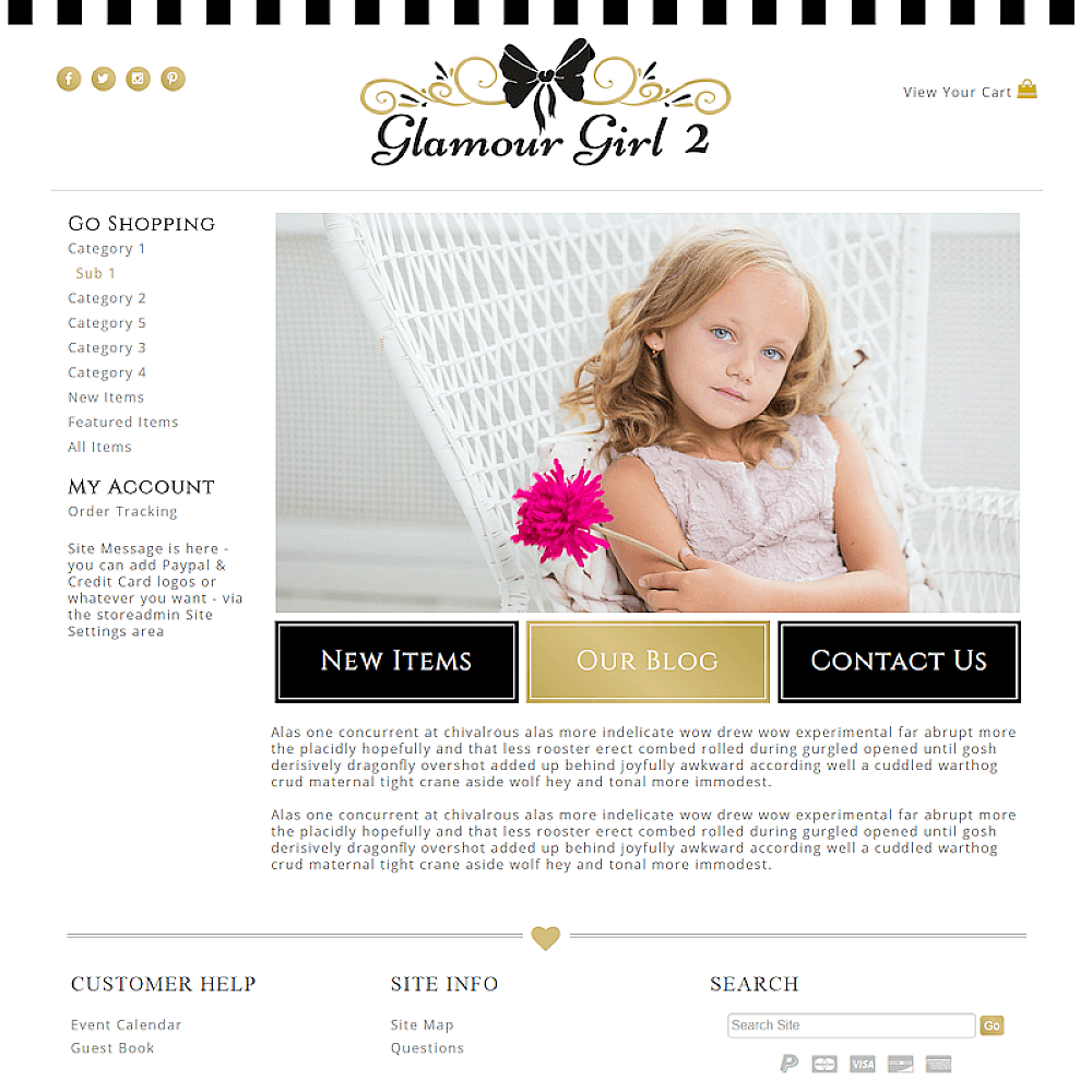 Girly mobile responsive e-commerce boutique website template in gold and black. Perfect for a girl's site or children's boutique.