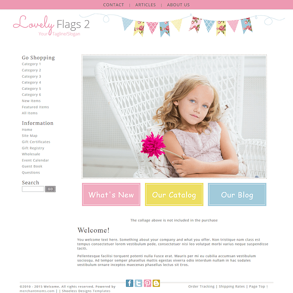 Premade simple, girly mobile responsive ecommerce boutique website template in pink, blue and yellow. Perfect for a girl's site or children's boutique.