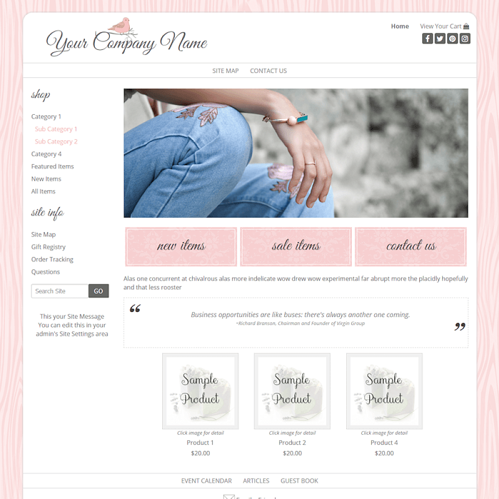 Premade simple, casual mobile responsive ecommerce website template in pink and white.