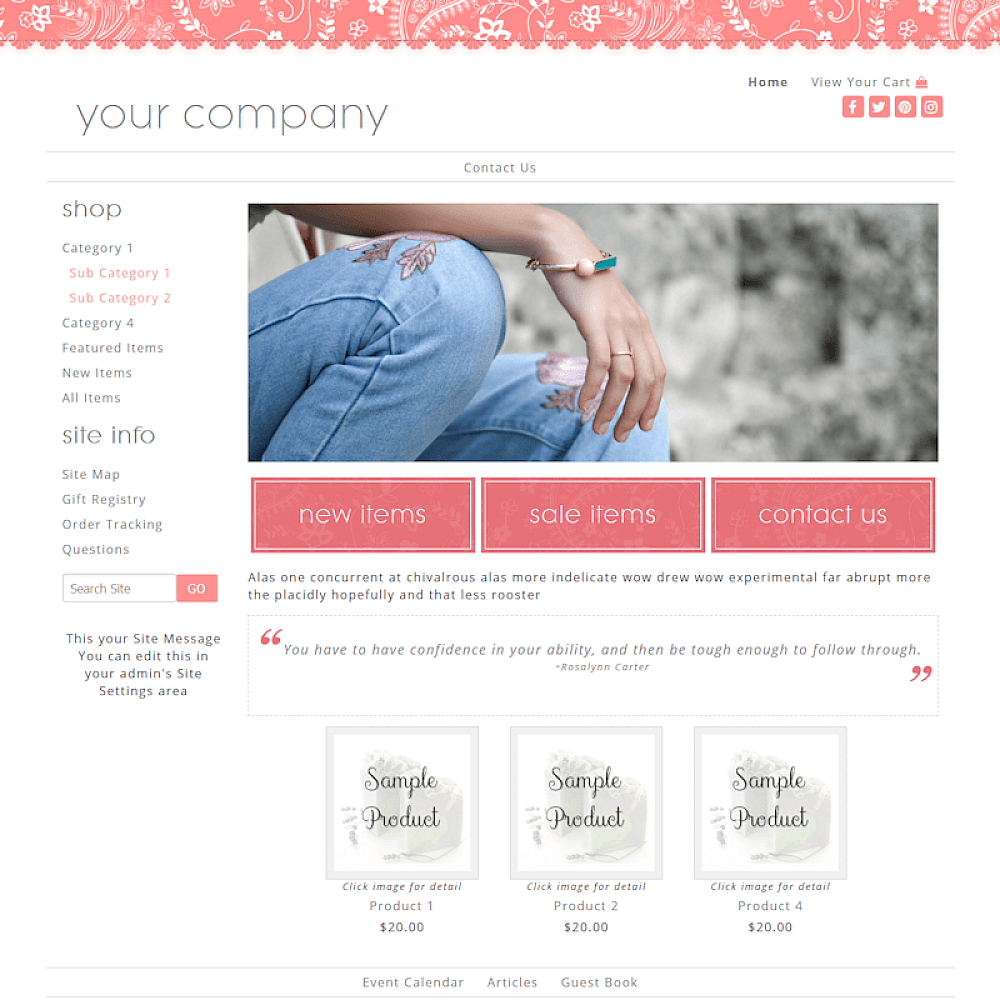 Premade mobile responsive ecommerce website design in salmon and white floral.